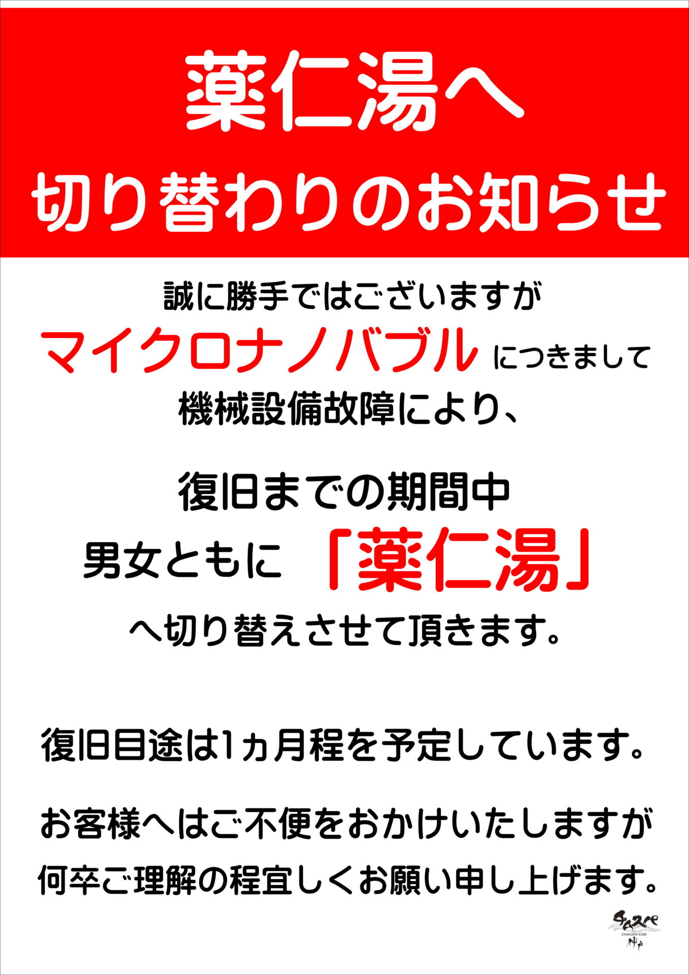 (故障)マイクロナノバブル→薬仁湯切り替えのお知らせ