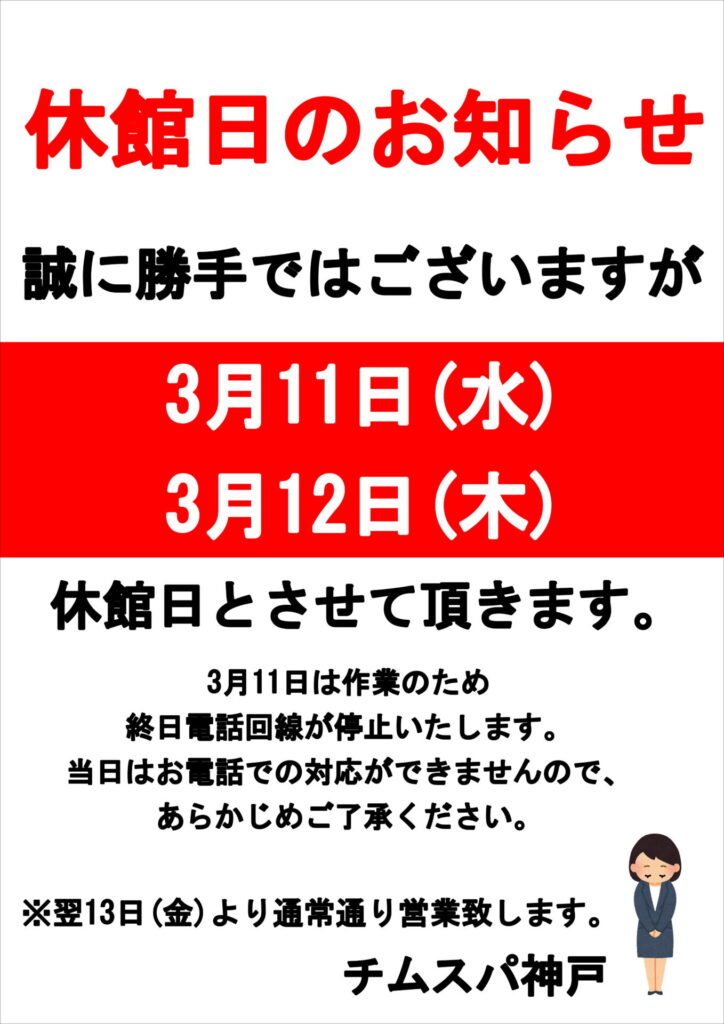 3月11日(水)・12日(木)は休館日となります。(メンテナンスの為)